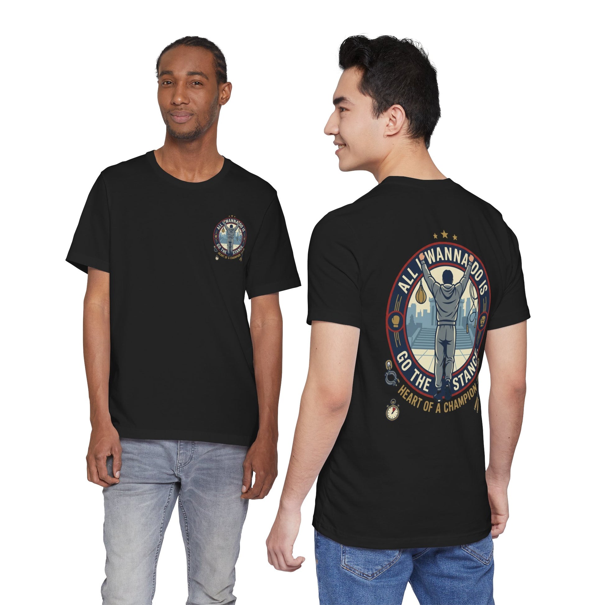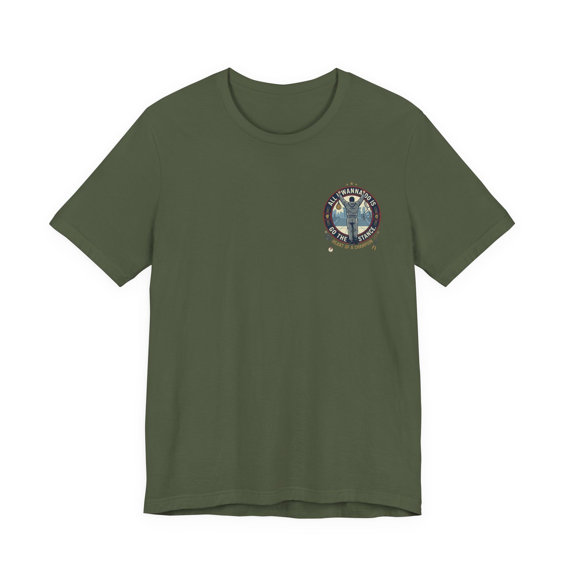 This lightweight tee carries a quiet confidence — a soft, breathable canvas that wears like a trusted companion. A small crest sits on the chest while a bold, vintage-style scene covers the back: a lone figure raising a bat against a stadium skyline, ringed by stars and the rallying line “All I wanna do is go the distance — heart of a champion.” It feels like late summer nights under stadium lights, the scrape of cleats, and the steady rhythm of practice that turns grit into pride. Wear it to warmups, weekend hangouts, or to nod to the grind that built you. The retail fit keeps the silhouette clean and easy to layer, and the tear-away label keeps comfort front and center.