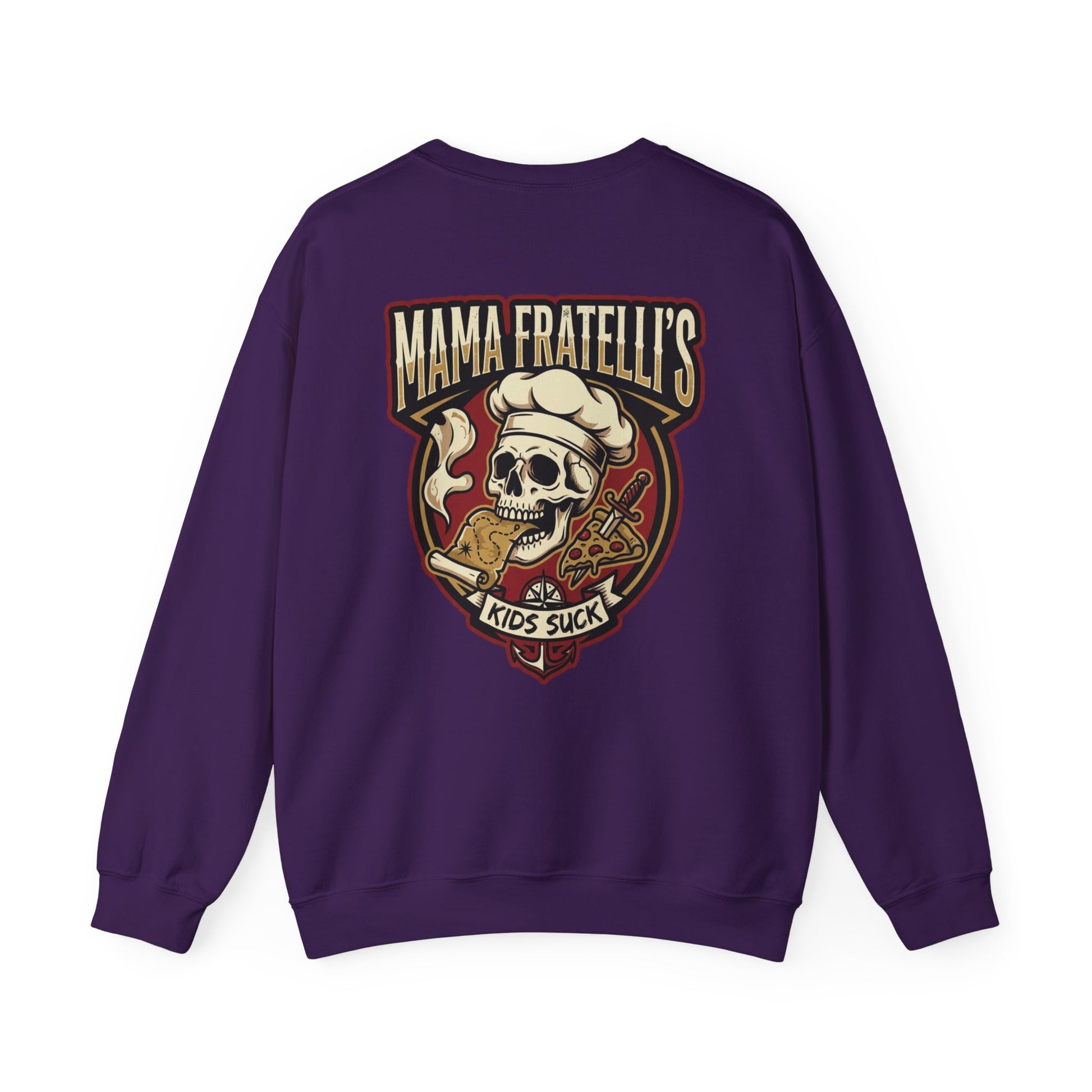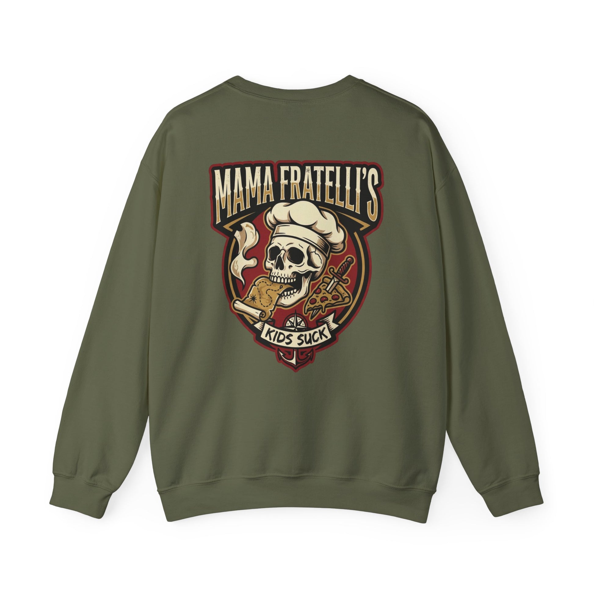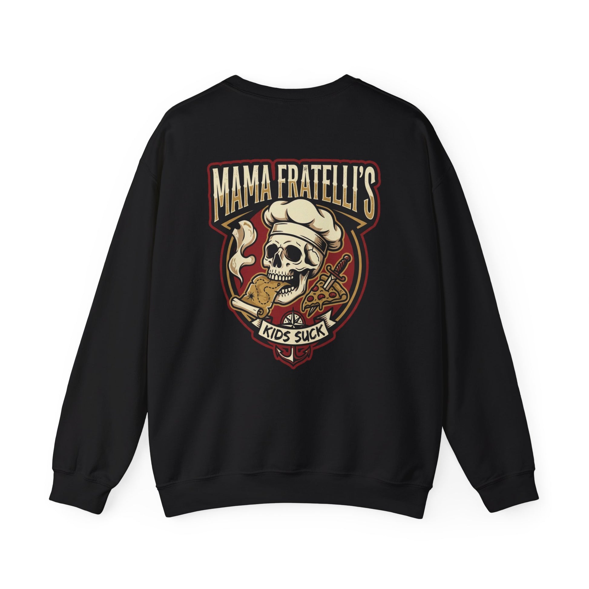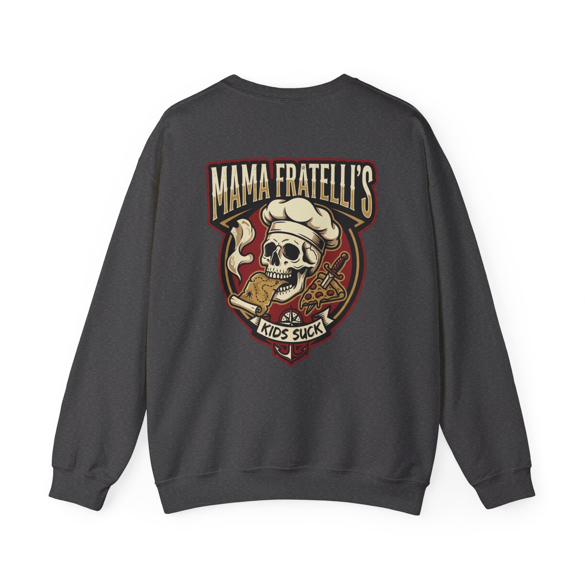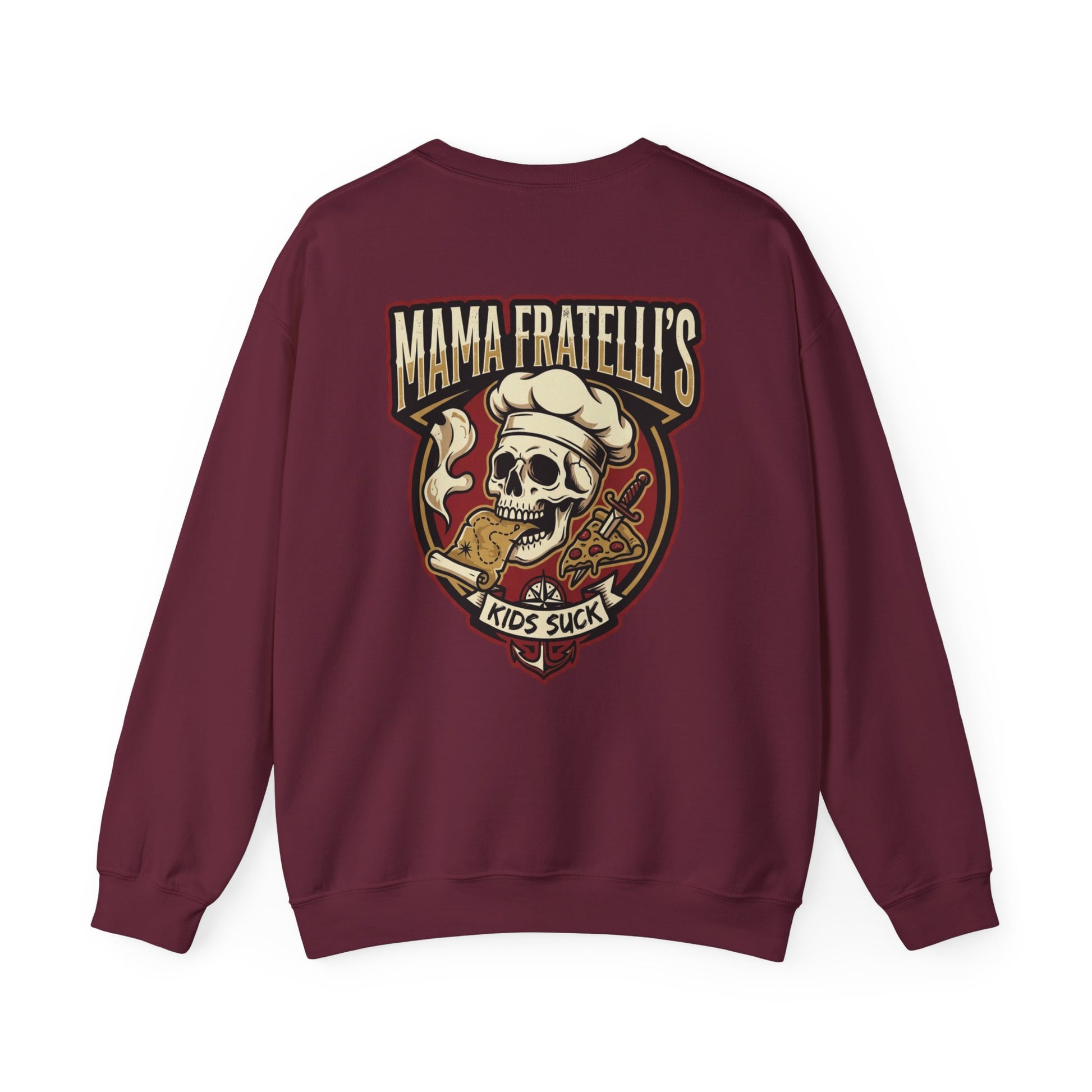 This heavyweight crewneck sweatshirt brings attitude and comfort together. The front features a subtle left-chest embroidered emblem, while the back shows a bold vintage-style graphic with a skull wearing a chef’s hat and pizza motifs — a cheeky, irreverent design for folks who love dark-humor streetwear and pizza culture. The cotton-poly blend feels substantial without being stiff, the ribbed collar and cuffs hold their shape, and the tubular knit body offers a clean, seam-free silhouette. Wear it to late-night pizza runs, band practice, or when you want to make a statement while staying warm.
