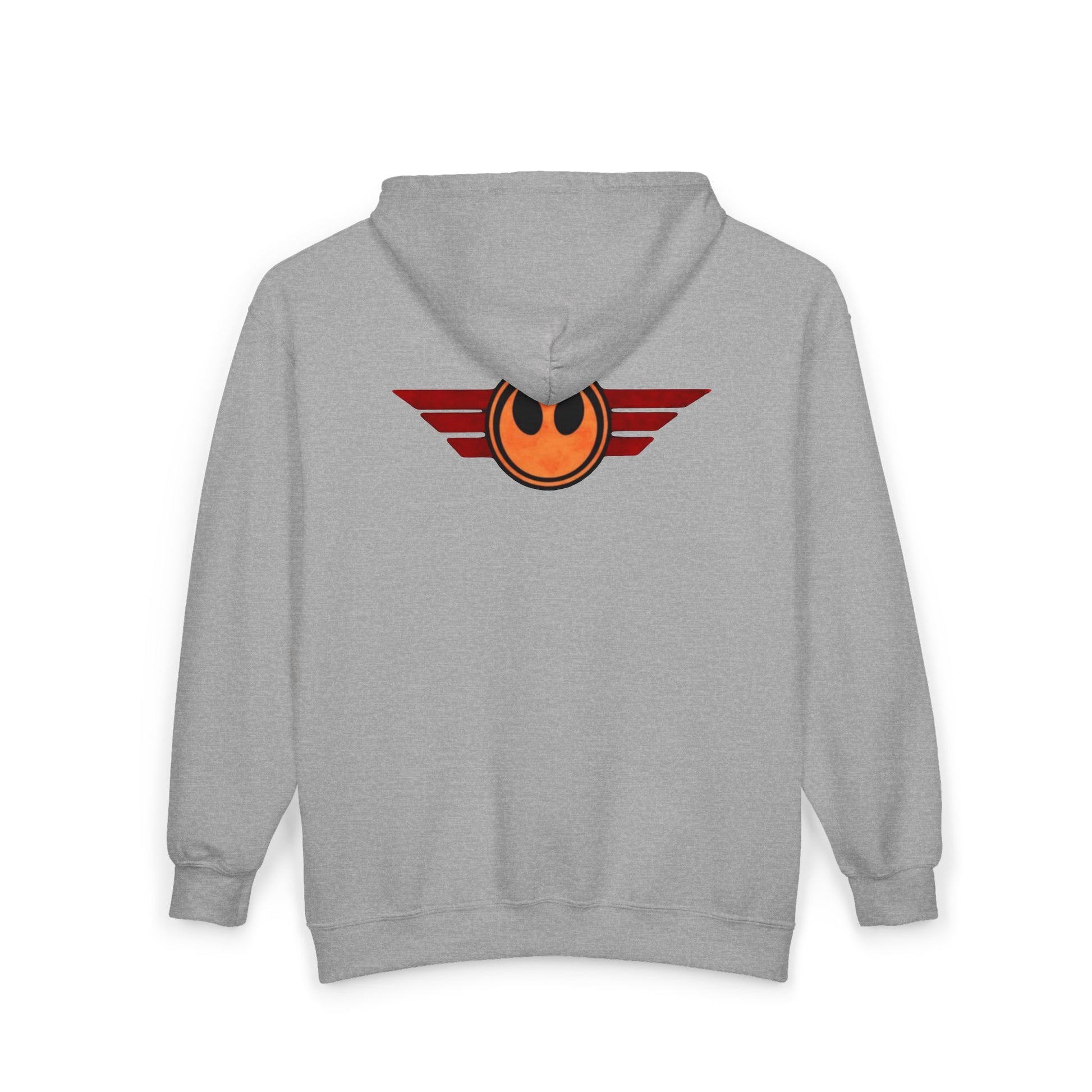 This zip-up hoodie brings quiet rebellion to everyday wear. The worn, winged emblem on the chest and back reads like a badge from late-night road trips and secret meetups — a subtle nod that blends vintage racer energy with geeky devotion. Slip it on when you want to feel grounded and ready: the roomy pockets hold your wallet and phone, the adjustable hood keeps out chill winds, and the medium-weight fabric settles into a lived-in comfort after a few wears. Embroidered chest detail and bold back artwork age into the fabric, making the hoodie feel like something you’ve already earned. It’s for people who collect stories, playlists, and starlit drives — the kind of piece that layers over tees on crisp evenings and becomes part of routine rituals.